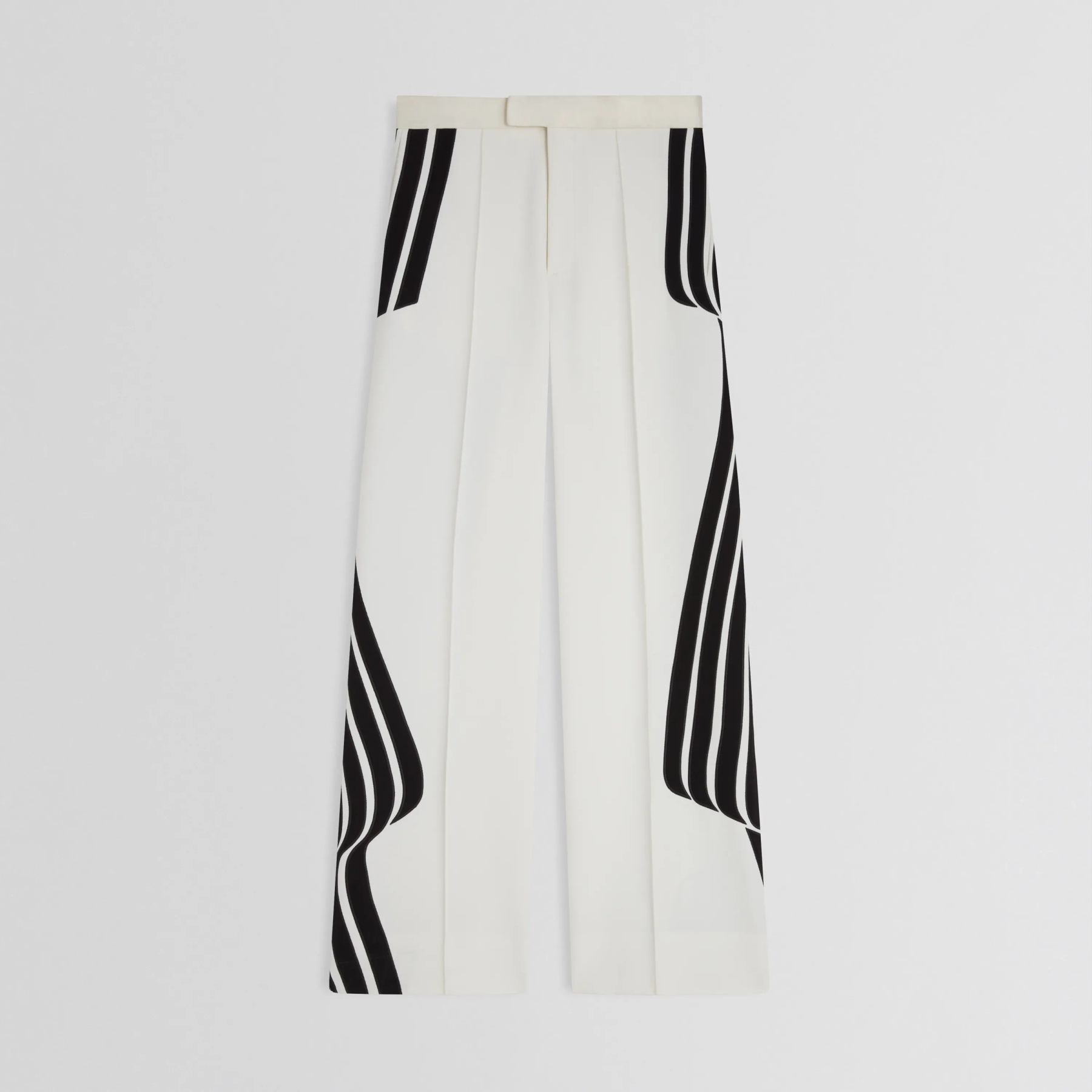 Elevator pitch: Tailored trousers with contrast wave stripes. Cut to sit on the mid-waist, the trousers have a straight leg, with an eased fit and a dropped rise. Textured fabric creates a structured silhouette.